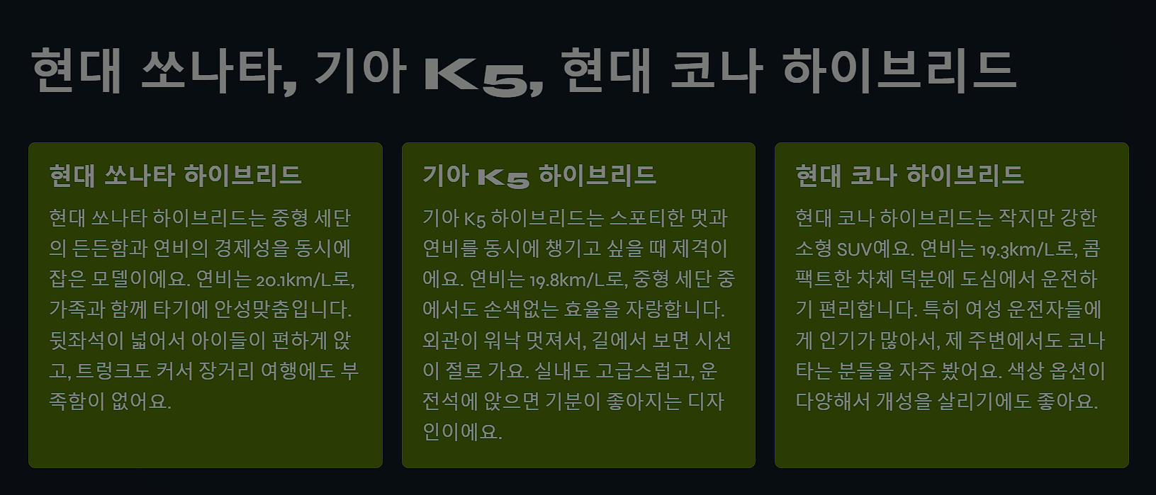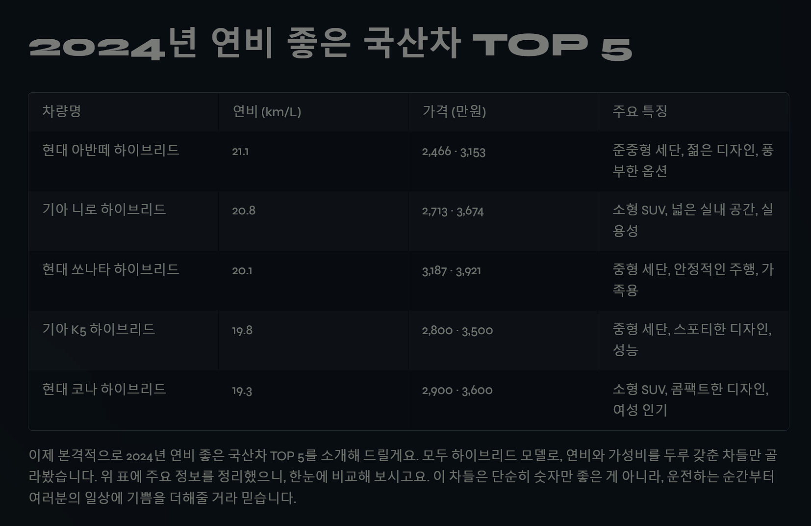 ์ฐ๋น ์ข์ ๊ตญ์ฐ์ฐจ TOP 5๋ฅผ ์๊ฐํด ๋๋ฆด๊ฒ์. ๋ชจ๋ ํ์ด๋ธ๋ฆฌ๋ ๋ชจ๋ธ๋ก, ์ฐ๋น์ ๊ฐ์ฑ๋น๋ฅผ ๋๋ฃจ ๊ฐ์ถ ์ฐจ๋ค๋ง ๊ณจ๋ผ๋ดค์ต๋๋ค. ์๋ ํ์ ์ฃผ์ ์ ๋ณด๋ฅผ ์ ๋ฆฌํ์ผ๋, ํ๋์ ๋น๊ตํด ๋ณด์๊ณ ์. ๊ทธ ๋ค์ ๊ฐ ์ฐจ๋์ ๋งค๋ ฅ์ ํ๋์ฉ ํ์ด๋ณผ๊ฒ์. ์ด ์ฐจ๋ค์ ๋จ์ํ ์ซ์๋ง ์ข์ ๊ฒ ์๋๋ผ, ์ด์ ํ๋ ์๊ฐ๋ถํฐ ์ฌ๋ฌ๋ถ์ ์ผ์์ ๊ธฐ์จ์ ๋ํด์ค ๊ฑฐ๋ผ ๋ฏฟ์ต๋๋ค.