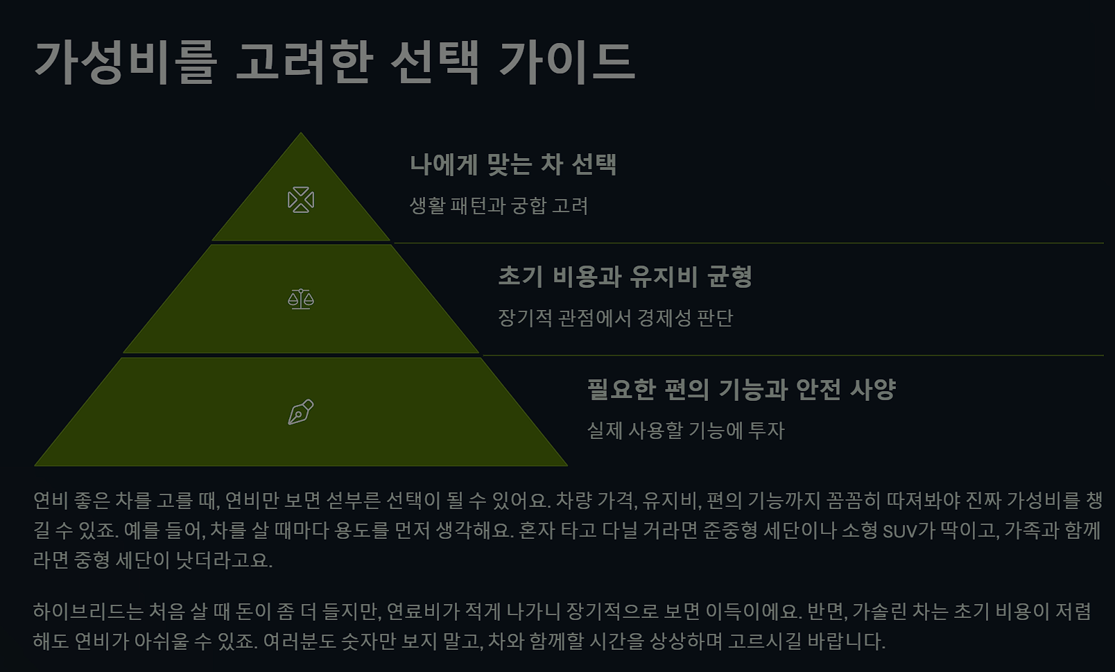 ์ด๊ธฐ ๋น์ฉ๊ณผ ์ ์ง๋น์ ๊ท ํ๋ ์ ๋ง์ถฐ์ผ ํด์. ํ์ด๋ธ๋ฆฌ๋๋ ์ฒ์ ์ด ๋ ๋์ด ์ข ๋ ๋ค์ง๋ง, ์ฐ๋ฃ๋น๊ฐ ์ ๊ฒ ๋๊ฐ๋ ์ฅ๊ธฐ์ ์ผ๋ก ๋ณด๋ฉด ์ด๋์ด์์. ๋ฐ๋ฉด, ๊ฐ์๋ฆฐ ์ฐจ๋ ์ด๊ธฐ ๋น์ฉ์ด ์ ๋ ดํด๋ ์ฐ๋น๊ฐ ์์ฌ์ธ ์ ์์ฃ . ์์ฐ์ด ๋๋ํ์ง ์๋ค๋ฉด ์๋ฐ๋ผ ํ์ด๋ธ๋ฆฌ๋์ฒ๋ผ ๊ฐ๊ฒฉ ๋๋น ์ฐ๋น๊ฐ ์ข์ ๋ชจ๋ธ์, ์กฐ๊ธ ๋ ํฌ์ํ ์ฌ๋ ฅ์ด ์๋ค๋ฉด ์๋ํ๋ K5์ฒ๋ผ ๋๋ํ ๊ณต๊ฐ๊ณผ ๊ธฐ๋ฅ์ ๊ฐ์ถ ์ฐจ๋ฅผ ์ถ์ฒ๋๋ฆฝ๋๋ค. ์ ๋ ์น๊ตฌ๊ฐ ์ฐจ๋ฅผ ๋ฐ๊พธ๋ฉด์ ์ ์ง๋น ๊ฑฑ์ ์์ด ์ ํ๊ณ ๋ค๋๋ ๊ฑธ ๋ณด๊ณ , ์ญ์ ์ ํ์ด ์ค์ํ๊ตฌ๋ ๋๊ผ์ด์. ์ฌ๋ฌ๋ถ๋ ์ซ์๋ง ๋ณด์ง ๋ง๊ณ , ์ฐจ์ ํจ๊ปํ ์๊ฐ์ ์์ํ๋ฉฐ ๊ณ ๋ฅด์๊ธธ ๋ฐ๋๋๋ค.