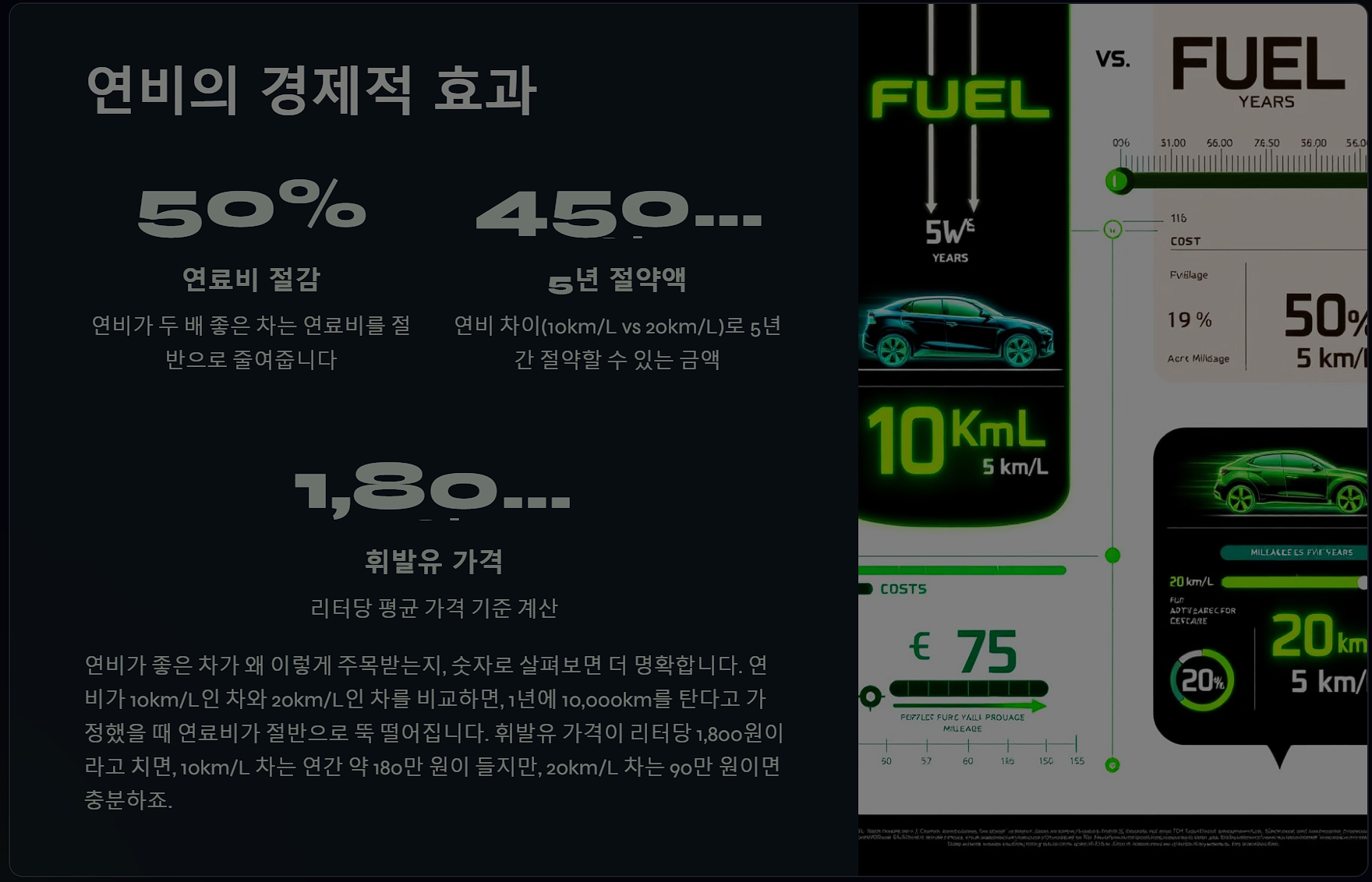 ์ฐ๋น๊ฐ ์ข์ ์ฐจ๊ฐ ์ ์ด๋ ๊ฒ ์ฃผ๋ชฉ๋ฐ๋์ง, ์ซ์๋ก ํ ๋ฒ ์ดํด๋ณผ๊น์? ์๋ฅผ ๋ค์ด, ์ฐ๋น๊ฐ 10km/L์ธ ์ฐจ์ 20km/L์ธ ์ฐจ๋ฅผ ๋น๊ตํ๋ฉด, 1๋