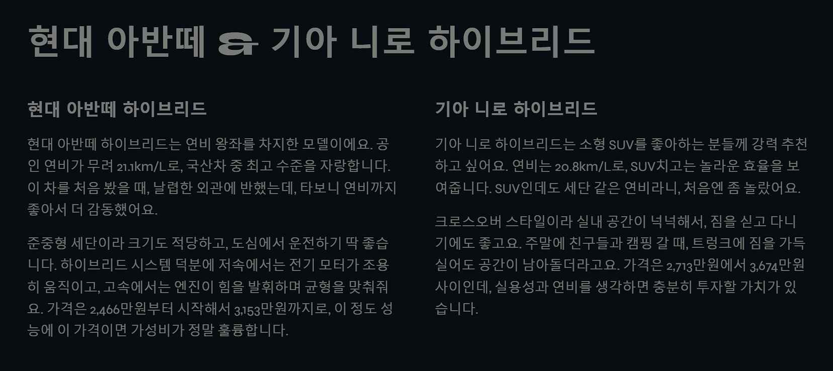 A2: ํ์ด๋ธ๋ฆฌ๋๋ ์ ๊ธฐ ๋ชจํฐ์ ์์ง์ ํจ๊ป ์จ์ ์ฐ๋น๊ฐ ํจ์ฌ ์ข๊ณ , ๋ฐฐ๊ธฐ๊ฐ์ค๋ ์ ์ต๋๋ค. ๊ฐ์๋ฆฐ ์ฐจ๋ ์ด๊ธฐ ๋น์ฉ์ด ๋ฎ์ง๋ง, ์ฐ๋ฃ ์๋ชจ๊ฐ ๋ง์์. ๋์ฌ ์ฃผํ์ด ๋ง๋ค๋ฉด ํ์ด๋ธ๋ฆฌ๋๊ฐ ์ ๋ฆฌํ๊ณ , ๊ฐ๊ฒฉ ๋ถ๋ด์ ๋๊ณ ์ถ๋ค๋ฉด ๊ฐ์๋ฆฐ ์ฐจ๋ ๊ด์ฐฎ์ฃ .