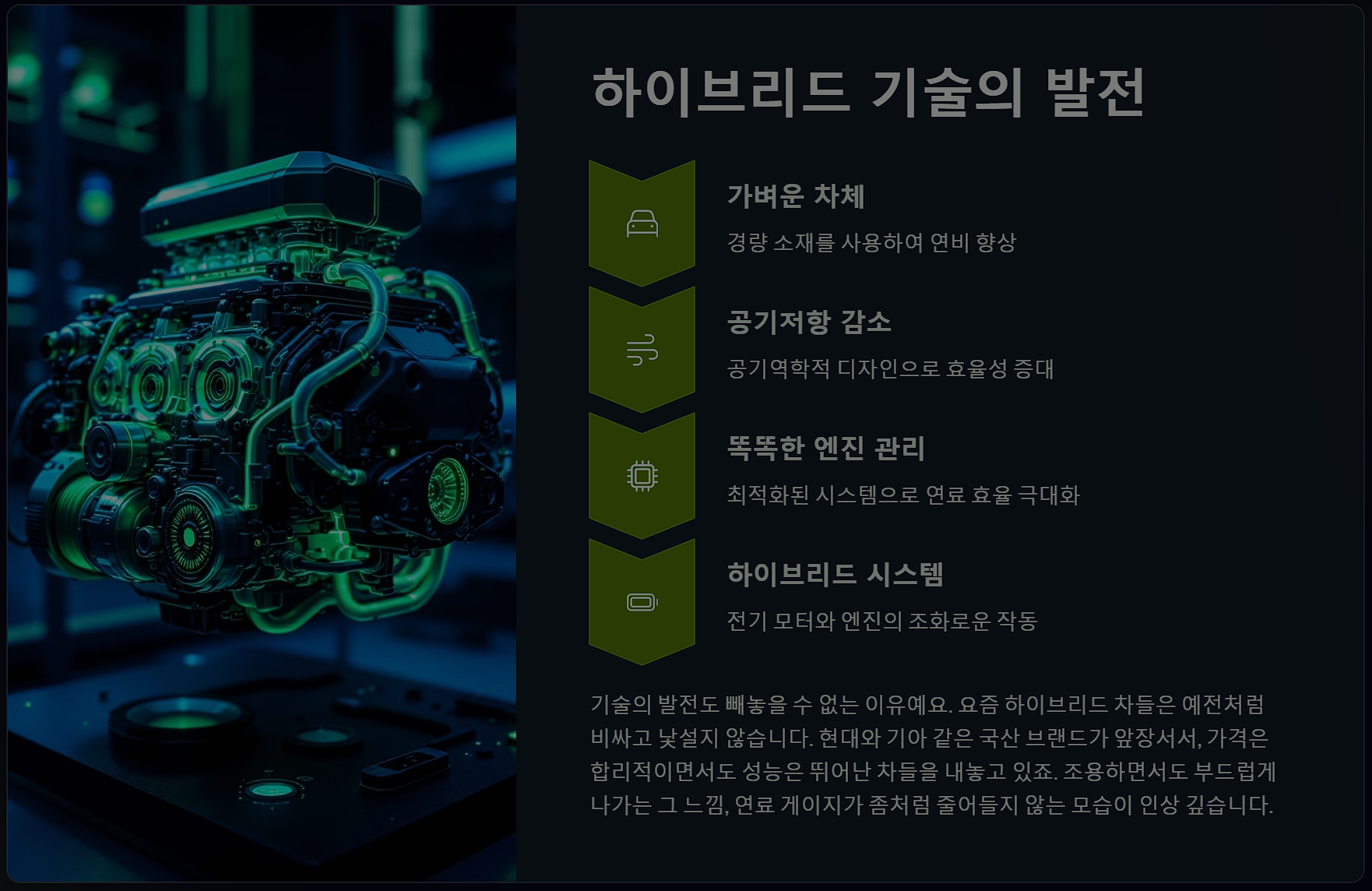 ๊ธฐ์ ์ ๋ฐ์ ๋ ๋นผ๋์ ์ ์๋ ์ด์ ์์. ์์ฆ ํ์ด๋ธ๋ฆฌ๋ ์ฐจ๋ค์ ์์ ์ฒ๋ผ ๋น์ธ๊ณ ๋ฏ์ค์ง ์์ต๋๋ค. ํ๋์ ๊ธฐ์ ๊ฐ์ ๊ตญ์ฐ ๋ธ๋๋๊ฐ ์์ฅ์์, ๊ฐ๊ฒฉ์ ํฉ๋ฆฌ์ ์ด๋ฉด์๋ ์ฑ๋ฅ์ ๋ฐ์ด๋ ์ฐจ๋ค์ ๋ด๋๊ณ ์์ฃ . ๊ฐ๋ฒผ์ด ์ฐจ์ฒด, ๊ณต๊ธฐ์ ํญ์ ์ค์ธ ๋์์ธ, ๊ทธ๋ฆฌ๊ณ ๋๋ํ ์์ง ๊ด๋ฆฌ ์์คํ