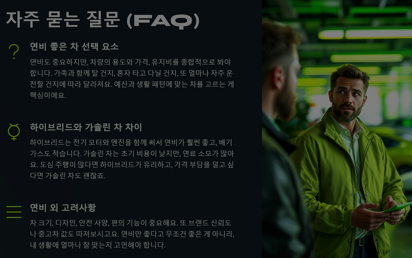 Q1: ์ฐ๋น ์ข์ ์ฐจ๋ฅผ ์ ํํ ๋ ๊ฐ์ฅ ์ค์ํ ์์๋ ๋ฌด์์ธ๊ฐ์?