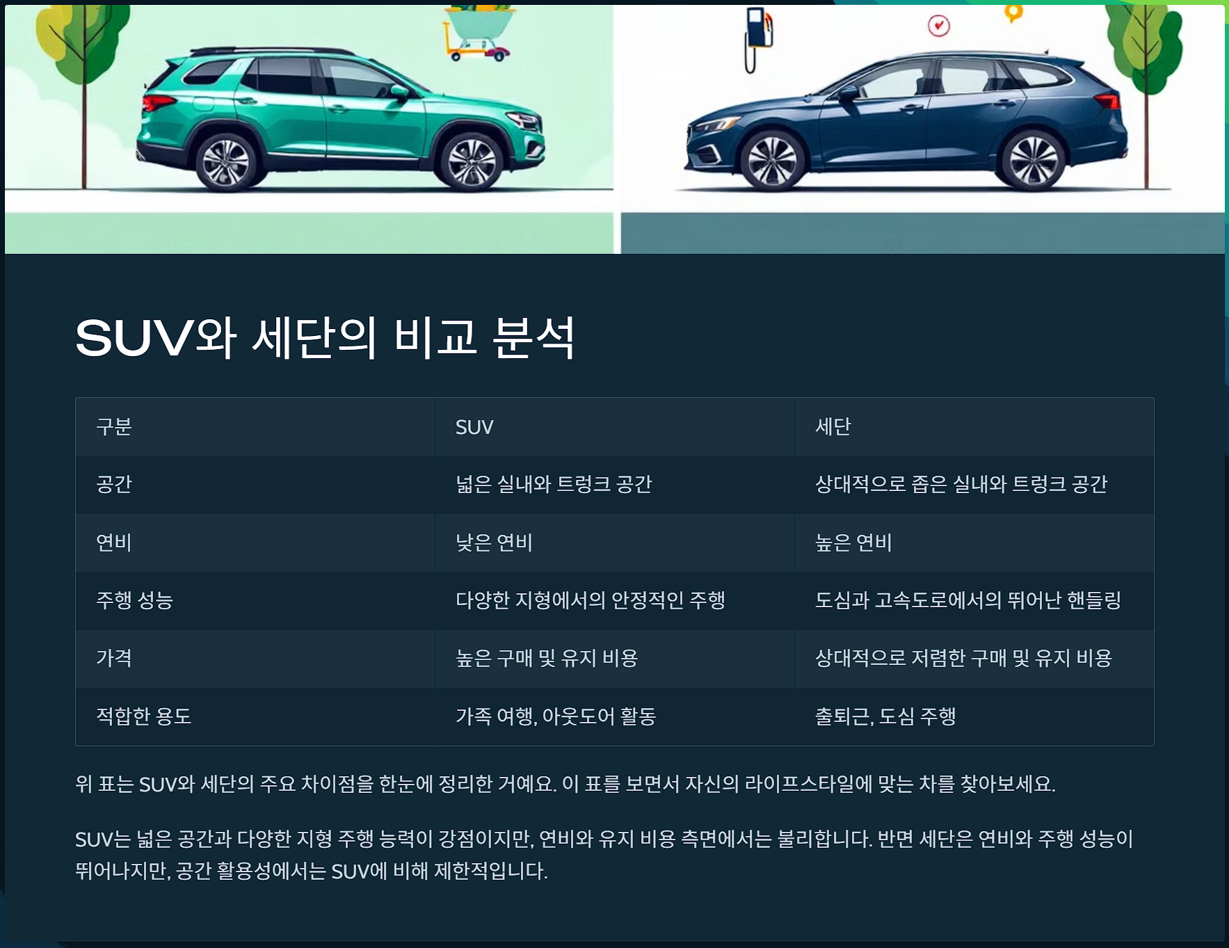 SUV์ ์ธ๋จ์ ๋น๊ต ๋ถ์